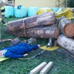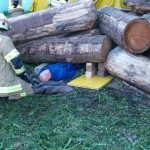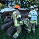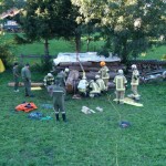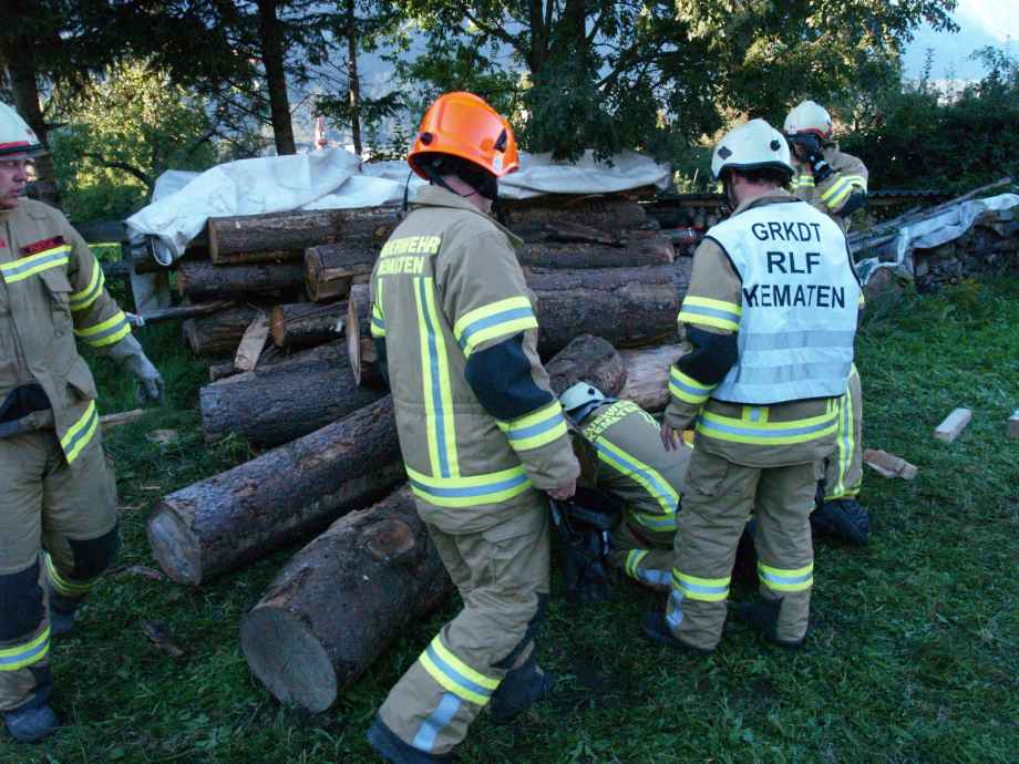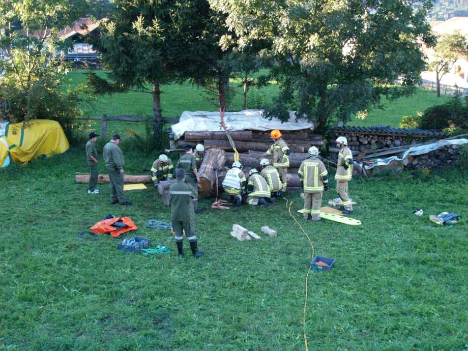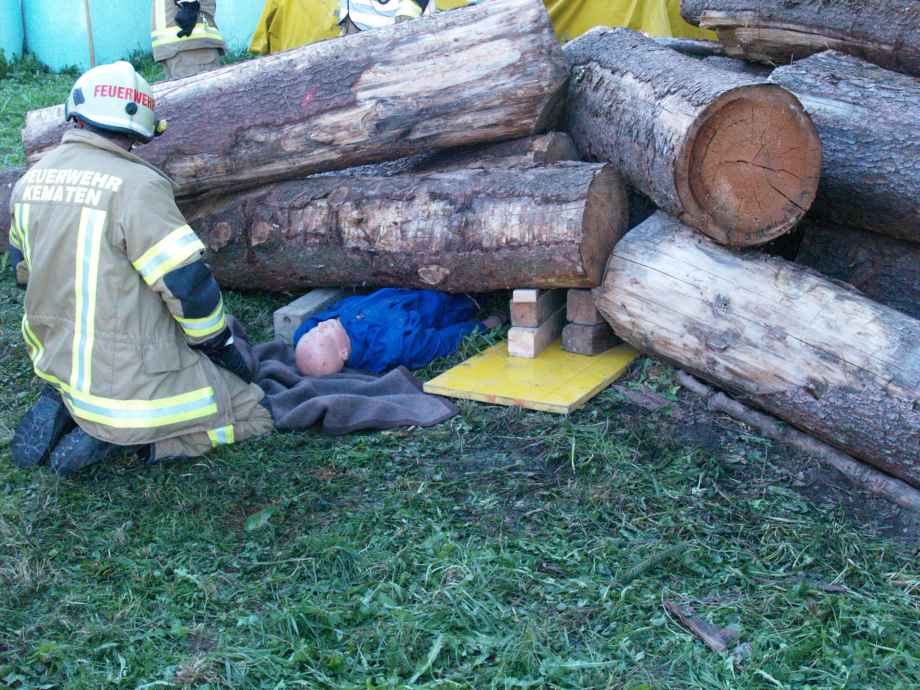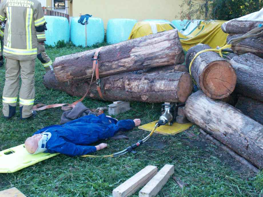 Weiter ging es mit einem Unfall bei Holzarbeiten. Angenommen wurde, dass sich ein Mann unter mehreren Baumstämmen eingeklemmt hatte. Bei dieser Übung wurde speziell auf ein sauberes Arbeiten und ausreichenden Selbstschutz geachtet. Zum Einsatz kamen dabei ein Hebekissen und das hydraulische Rettungsgerät.