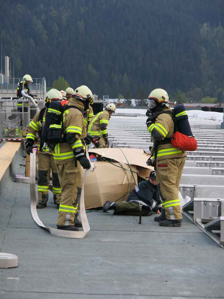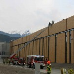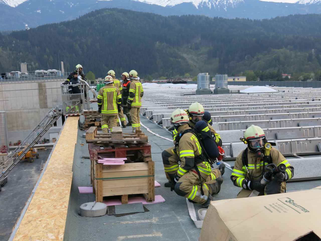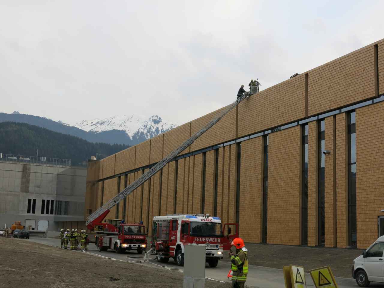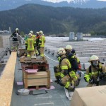 Heute fand in Völs eine Gemeinschaftsübung beim Neubau der M-Preis Bäckerei/Fleischerei statt. Übungsannahme war ein Brand im oberen Stockwerk und auf dem Dach, welcher durch Bauarbeiten verursacht wurde. Mehrere verletzte Personen mussten über die Drehleiter bzw. das Stiegenhaus geborgen werden. Die Atemschutzträger waren auch mit verschiedenen Gefahrenstoffen (Gasflaschen) konfrontiert. Im Einsatz waren das KDO, TLF-A und LF mit 26 Mann der Freiwilligen Feuerwehr Kematen.