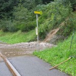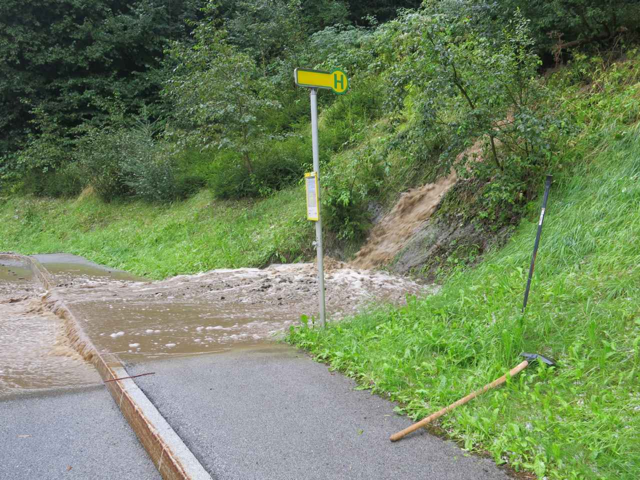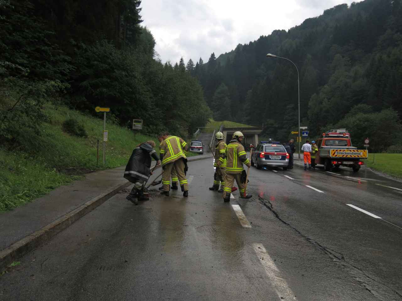 Die Straße musste kurzzeitig gesperrt werden um das angschwemmte Geröll zu beseitigen. Mithilfe eines über die Leitstelle angefordertem Kranfahrzeug, konnte die Reinigung rasch durchgeführt und die Straße wieder freigegben werden.