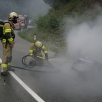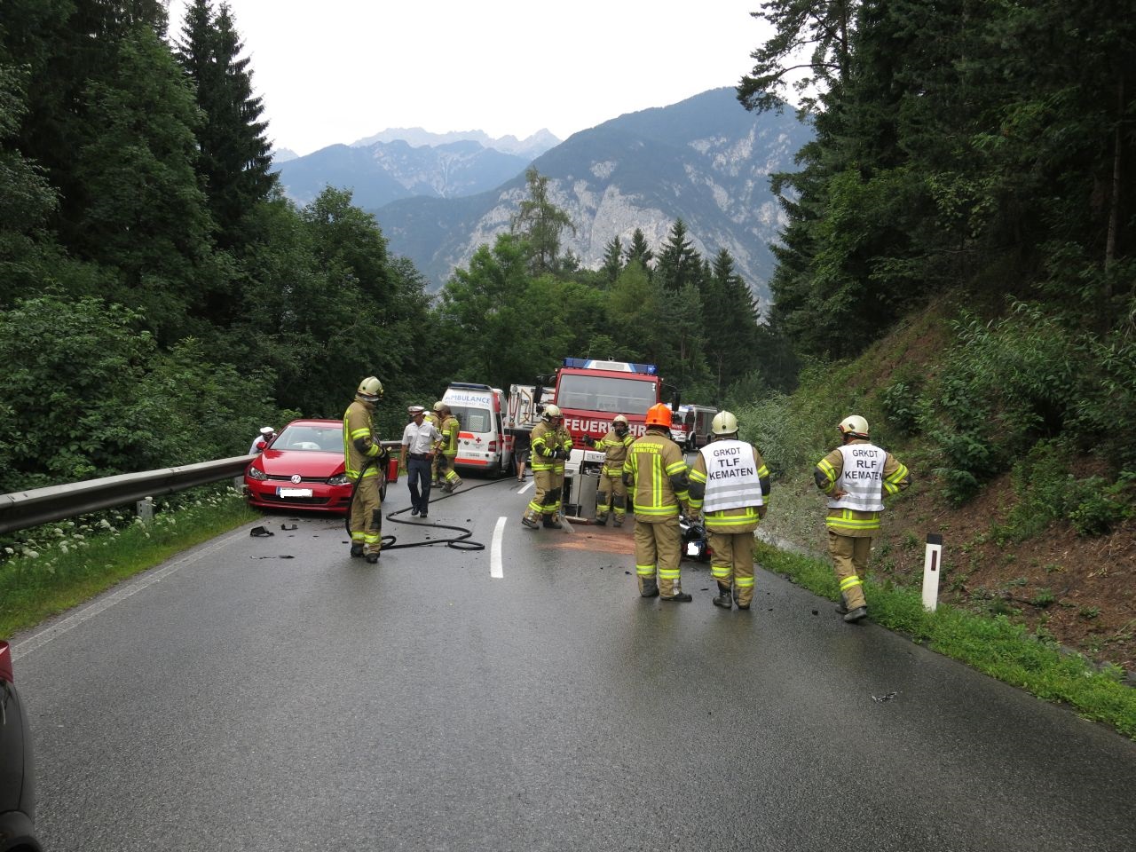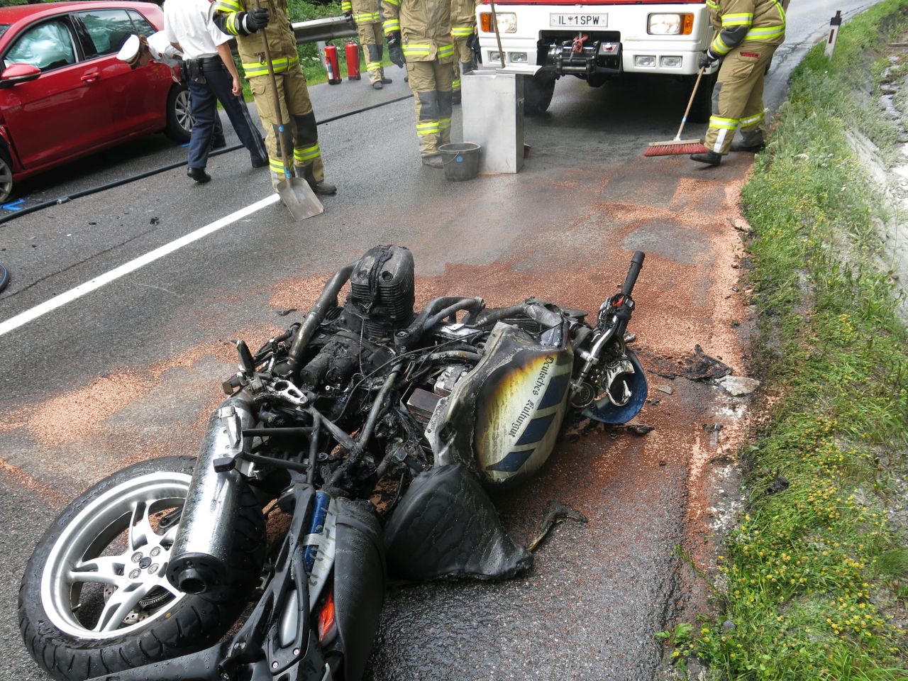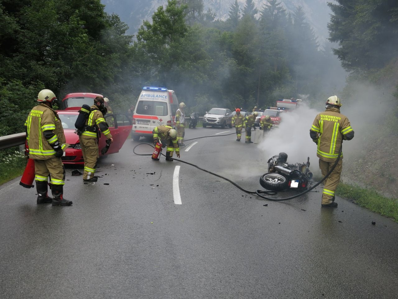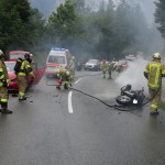 Um 14:59 Uhr wurde die Feuerwehr Kematen zu einem Verkehrsunfall mit Fahrzeugbrand auf der Axamer Straße gerufen. Es stellte sich heraus, dass es sich bei dem brennenden Fahrzeug um ein Motorrad handelte welches mit einem PKW kollidierte. Der Brand konnte rasch mittels Pulverlöscher und HD Rohr gelöscht werden. Außerdem war noch ein weiterer PKW, der von einem herumfliegenden Fahrzeugteil getroffen wurde, am Unfall beteiligt. Alle beteiligten Personen konnten unmittelbar von der Rettung versorgt werden.