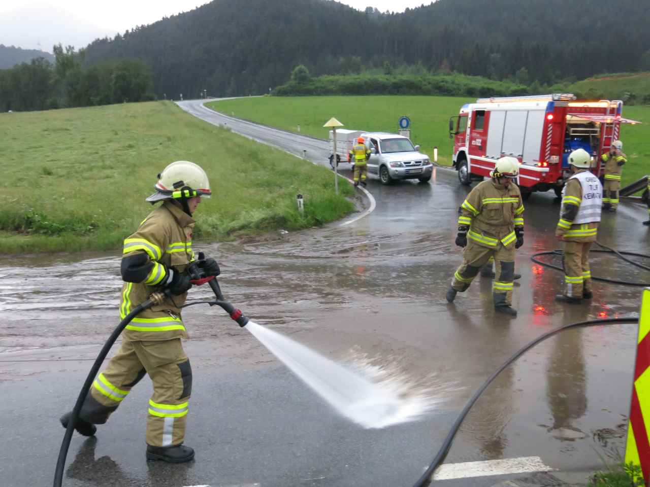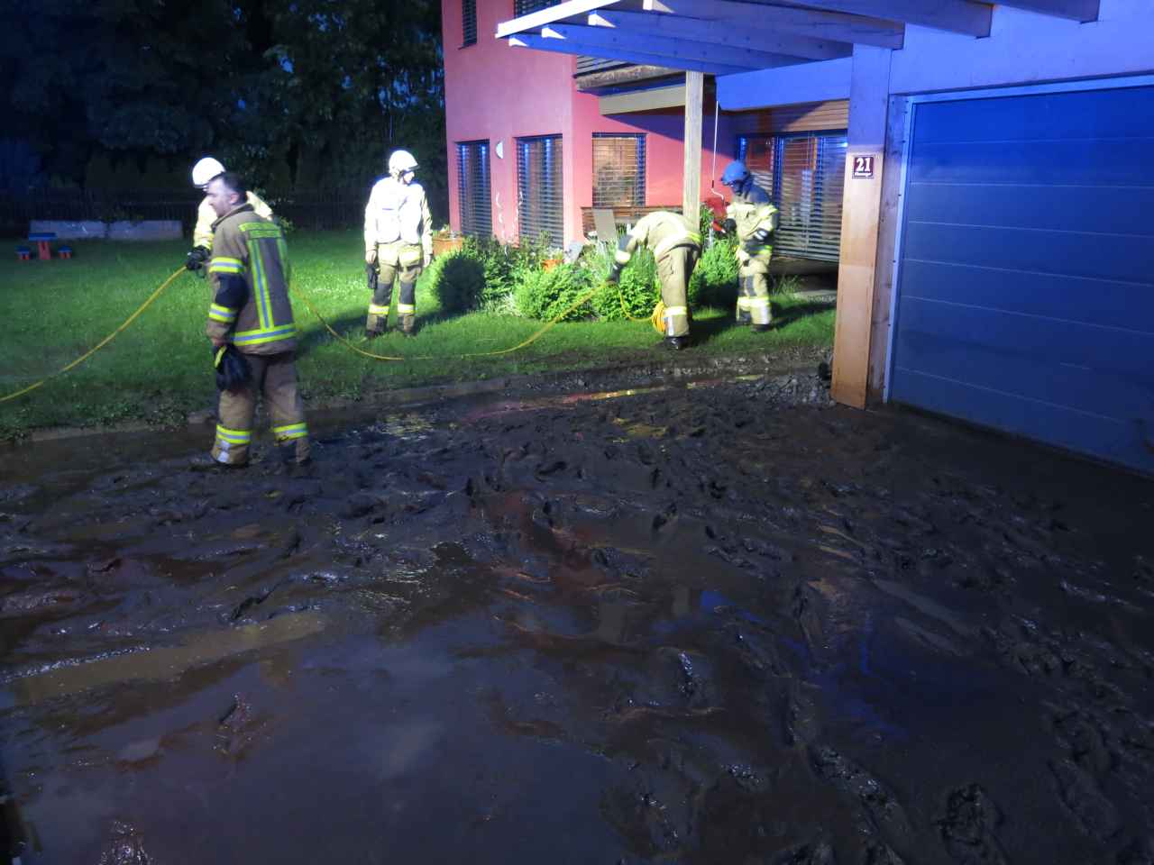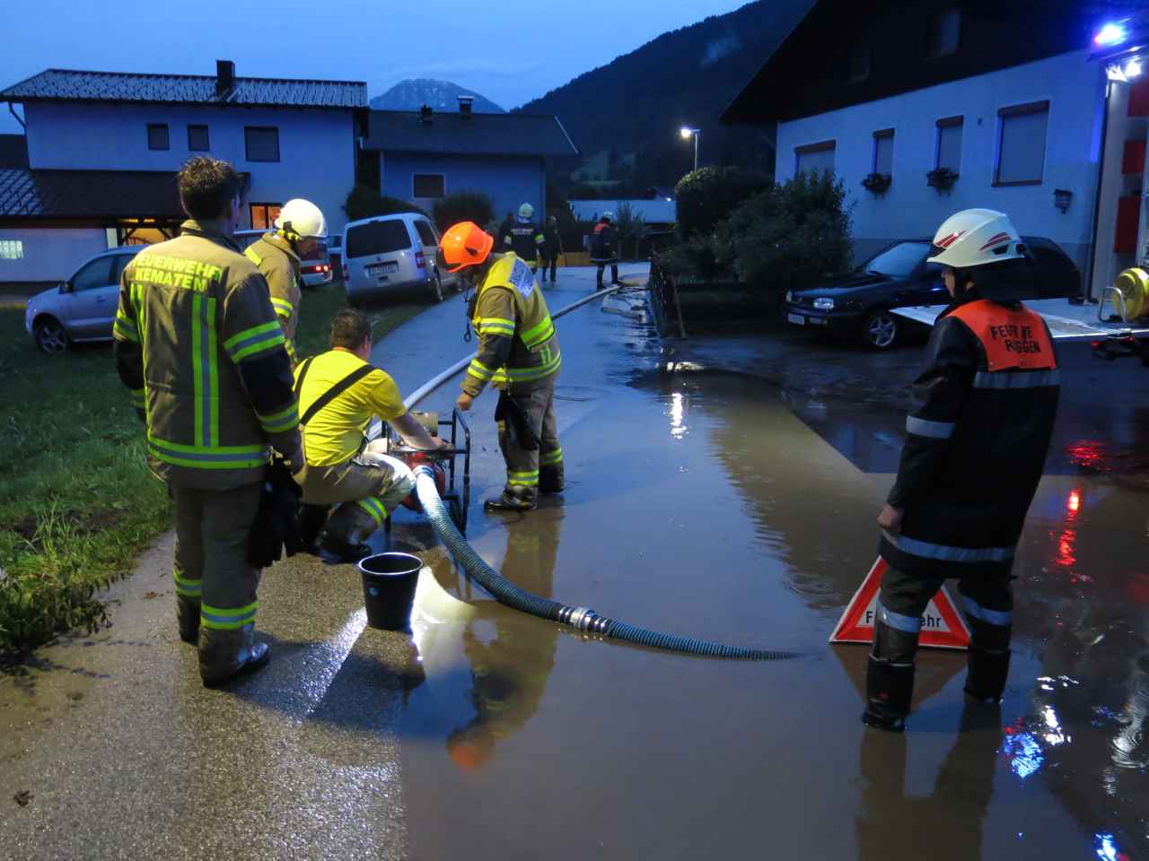 Gegen 18:30 Uhr wurde die Feuerwehr Kematen zu mehreren Einsätzen im Ortsgebiet gerufen. Am Dorfplatz wurde durch das Unwetter und den starken Regen Kanaldeckel nach oben gedrückt und der Dorfplatz überflutet. Auch drang in das Untergeschoss des Gemeindezentrums Wasser ein und ein Teil des Probelokals der Musikkapelle wurde in Mitleidenschaft gezogen. Außerdem bildete sich am nördlichen Eingang des Gemeindeamtes eine ca. 50 cm tiefe Wasseransammlung. Hier drohte das Wasser auch in das Gebäude einzudringen, was wir durch rasches Abpumpen und freimachen der Ablaufrinne verhindern konnten. Weitere kleinere Kellerüberflutungen im Gemeindegebiet konnten rasch behoben werden.
