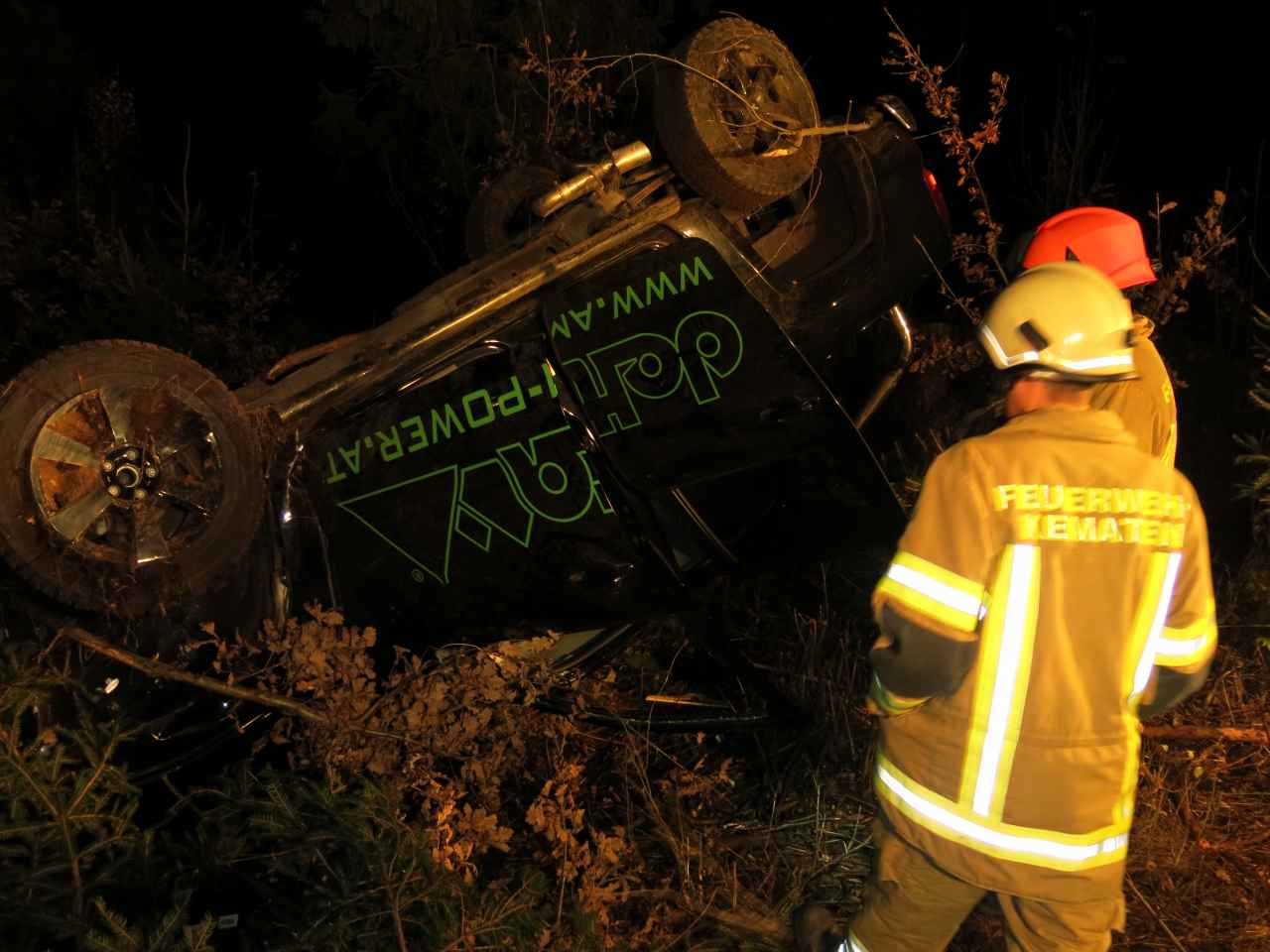 Die Feuerwehr Kematen wurde am Samstag Abend zu einem Verkehrsunfall auf der Oberperfer Landstraße alarmiert. Das Fahrzeug, welches Richtung Unterperfuss fuhr, kam in einer Linkskurve von der Fahrbahn ab. In weiterer Folge fuhr es über eine Böschung und kam auf dem Dach liegend im Wald zum Stillstand. Der verunfallte Lenker konnte das Fahrzeug selbständig verlassen und wurde von der Rettung in die Klinik transportiert. Unsere Aufgabe war es die Unfallstelle zu beleuchten und den Verkehr zu regeln.