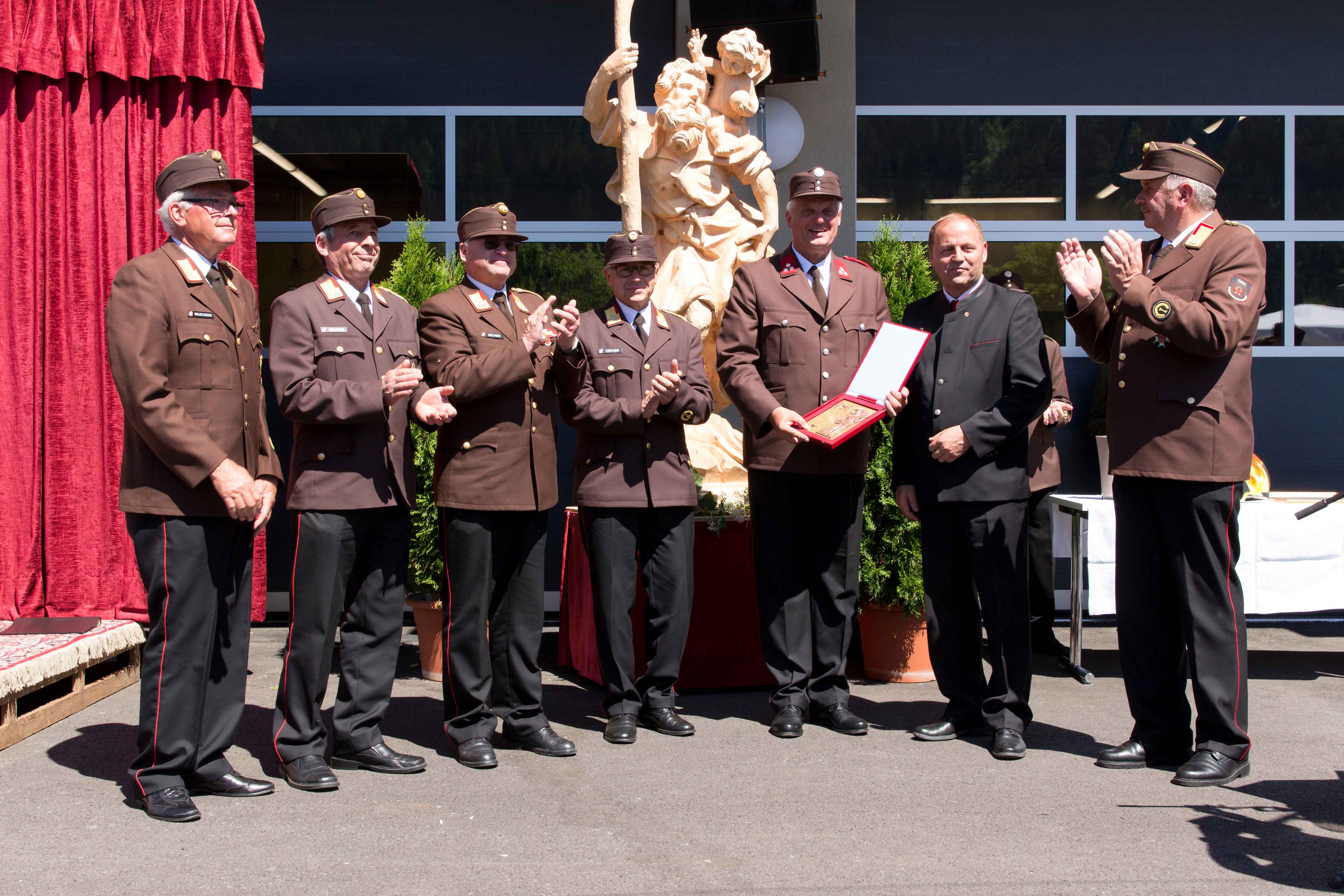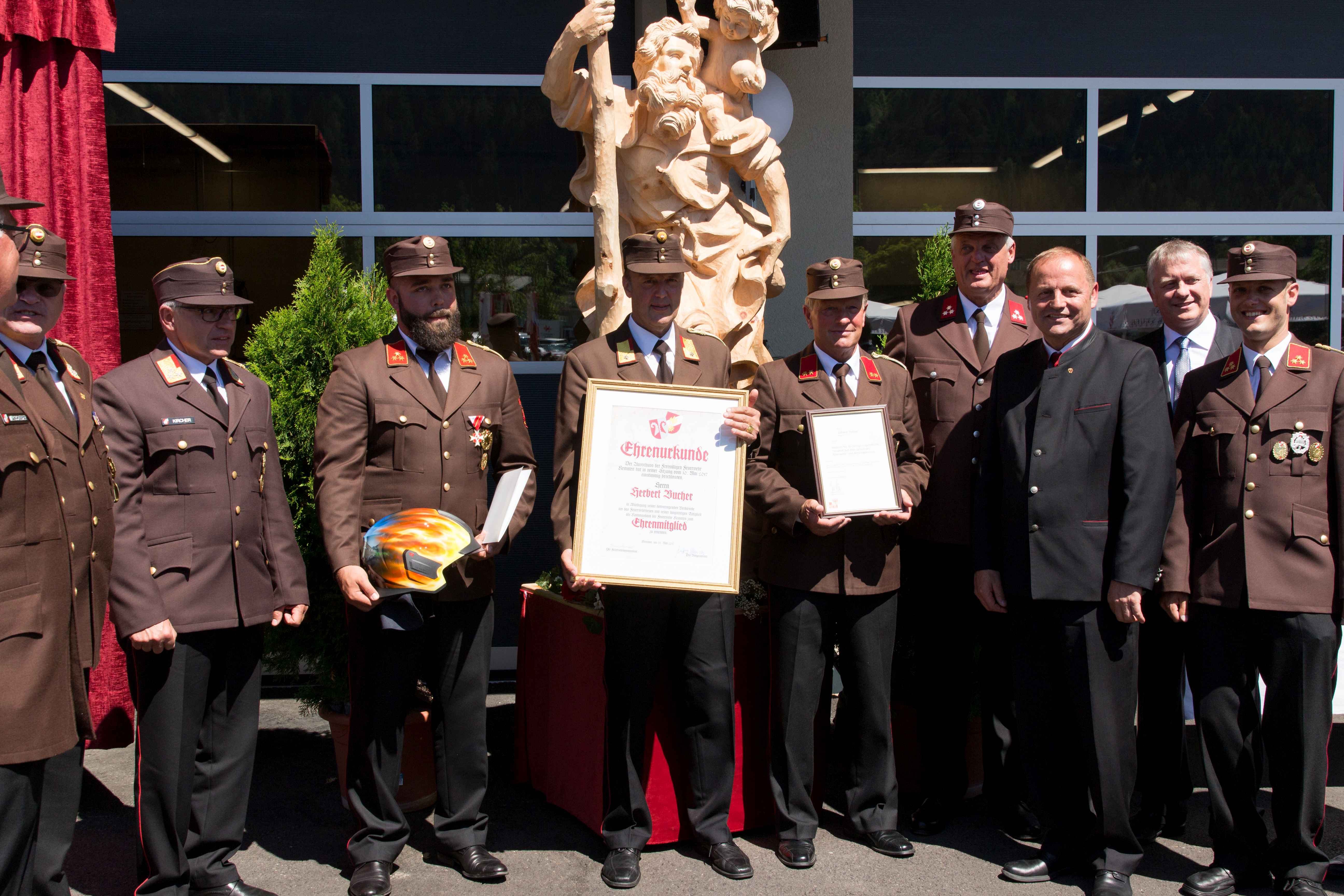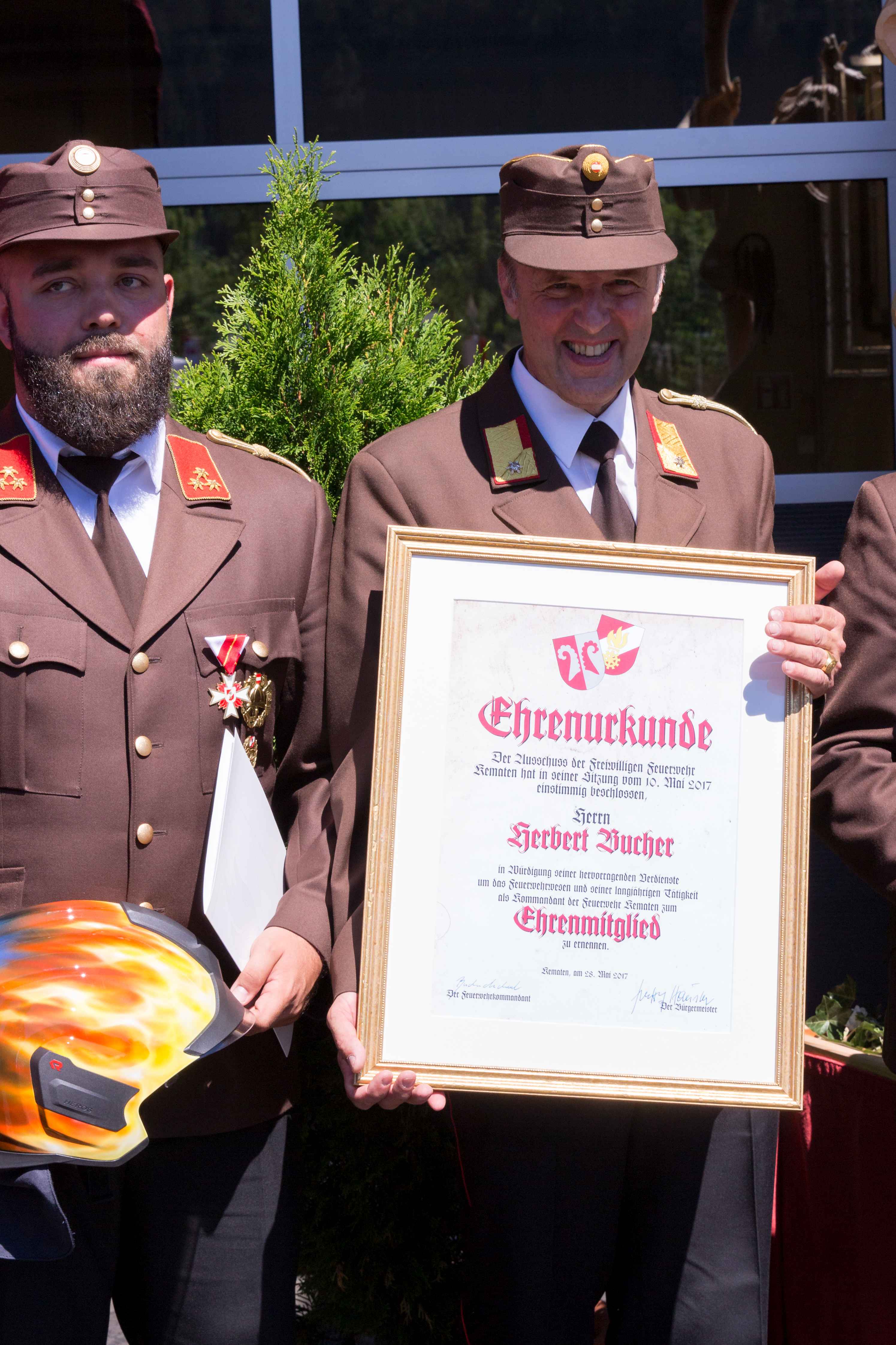 Die feierliche Stimmung wurde außerdem genützt um Ehrungen durchzuführen. So wurde Bgm. Rudolf Häusler für seine Verdienste um das Feuerwehrwesen mit der Florianiplakette ausgezeichnet. Bernhard Bucher, Kommandant a.D. erhielt das Verdienstzeichen in Gold Stufe 3 für die Verdienste, unter seiner Kommandantschaft rund um den Bau des Einsatzzentrums. Johann Haller, Kdt-Stv. a.D, erhielt für 40-jährige Tätigkeit im Feuerwehr- und Rettungswesen eine Verdienstmedaille verliehen. Alt-Kommandant Herbert Bucher wurde an diesem Tag zum Ehrenmitglied der Freiwilligen Feuerwehr Kematen ernannt. Die Ehrengäste, sowie das Kommando der Feuerwehr Kematen gratulierten den ausgezeichneten bzw. geehrten Kameraden und dankten für die Leistungen und Verdienste rund um das Feuerwehrwesen.