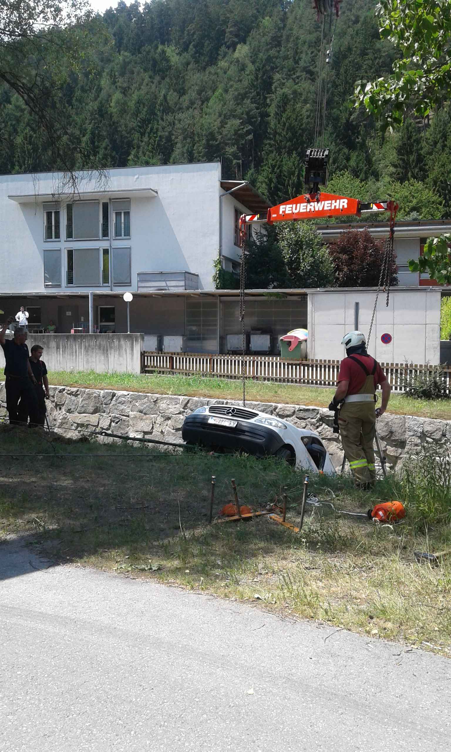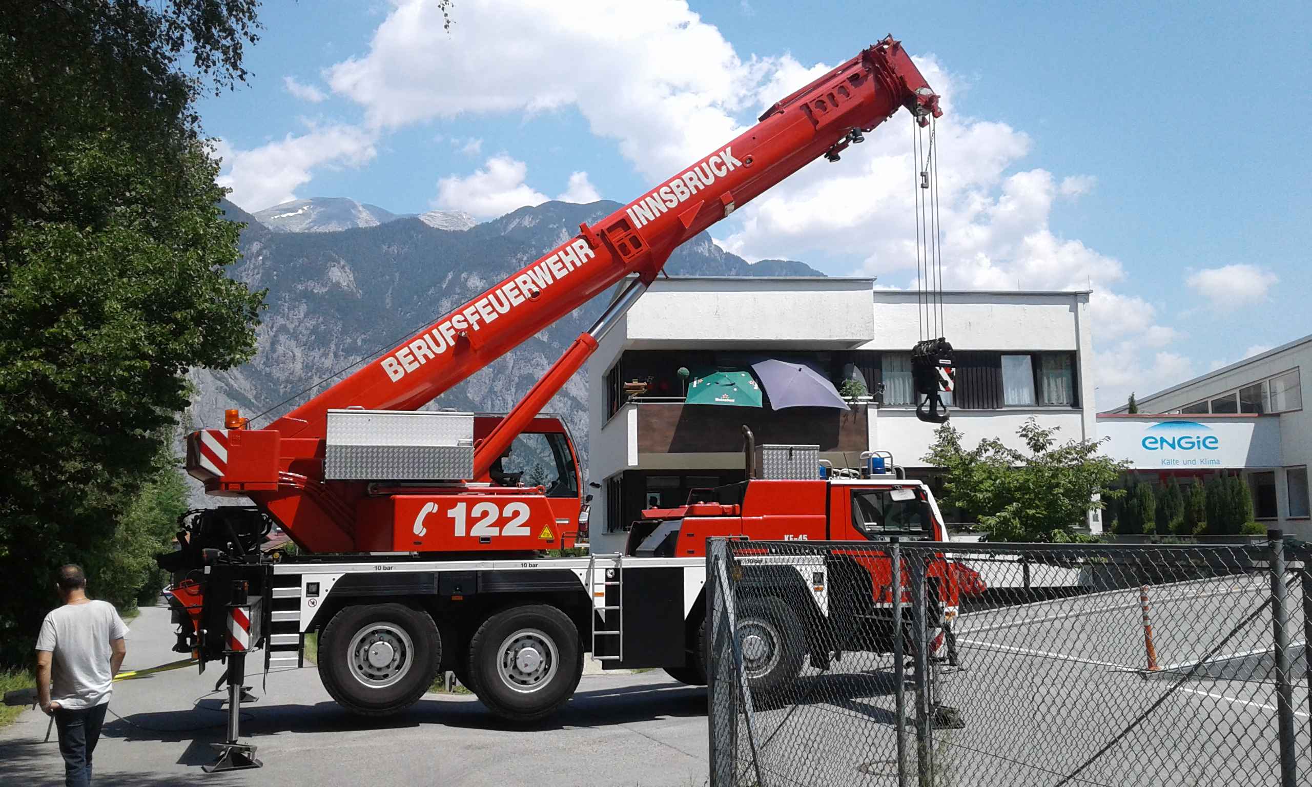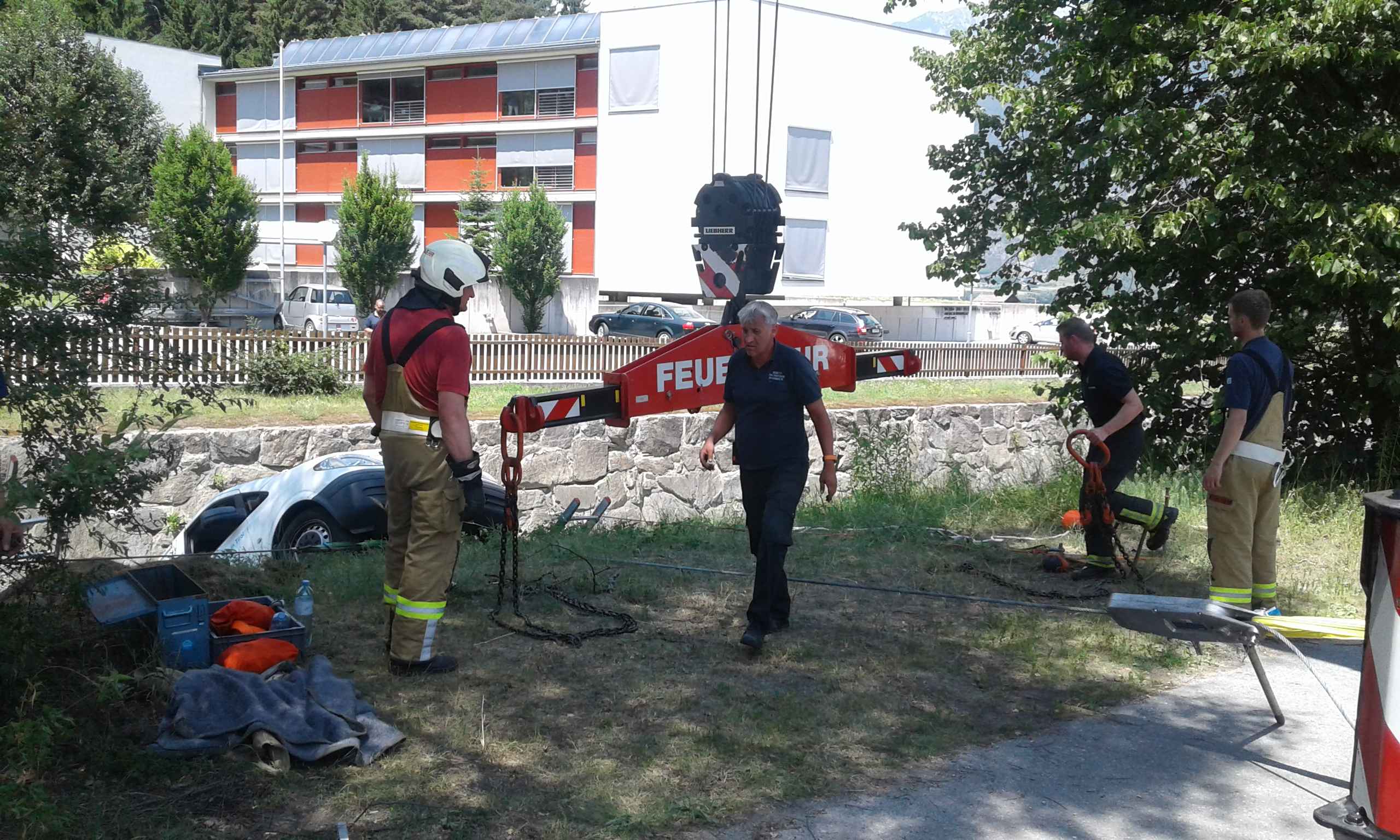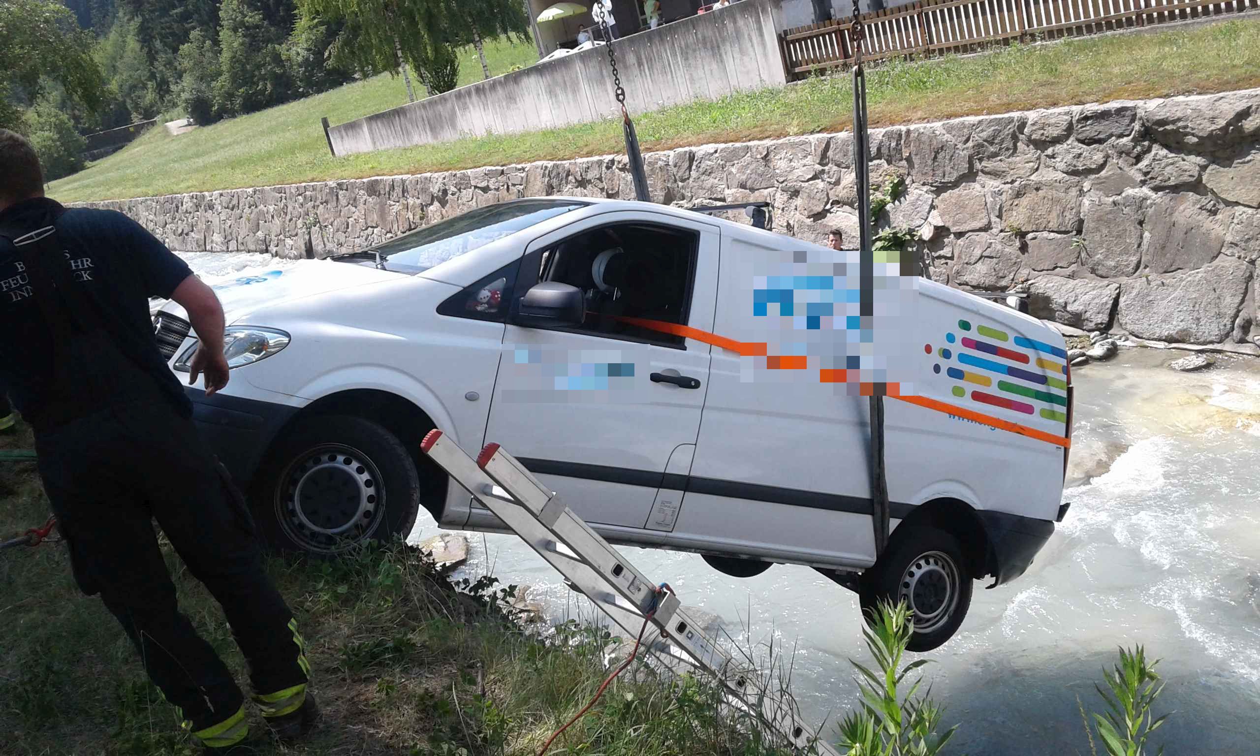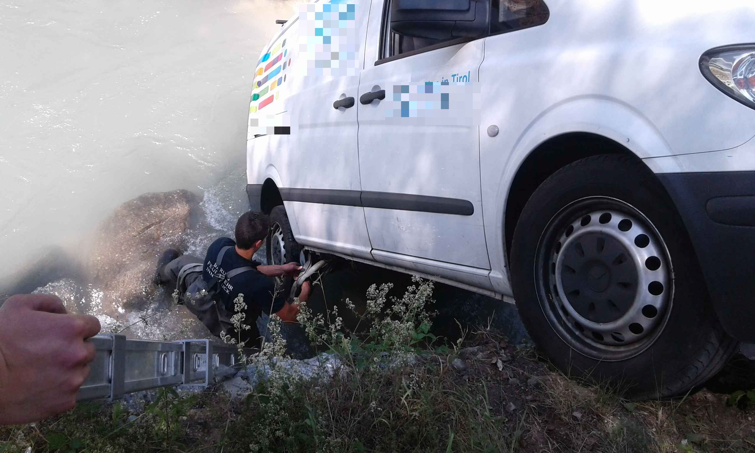 Am Donnerstag, 22.6.2017 wurden wir zu einem Fahrzeugabsturz im Bereich der Melach/Messerschmittweg gerufen. Es war ein Servicewagen eines Kältetechnikunternehmens in die Melach gestürzt – es befand sich keine Person in Notlage. Im Heck des Fahrzeugs befanden sich Gasflaschen unter Druck (200 bar), welche lt. dem Fahrer als Kältemittel für Klimaanlagen dienen. Die Heckklappe des Fahrzeugs wurde gesichert um zu verhindern, dass die Gasflaschen und andere im Fahrzeug befindliche Gegenstände bei der Bergung aus dem Laderaum in den Bach gelangen. Wir sicherten das Fahrzeug mittels Hubzug und schufen einen Zugang zum verunfallten Fahrzeug mittels Steckleiter. Die Bergung erfolgte mittels Kran der Berufsfeuerwehr Innsbruck. Wir waren ca. 2 Stunden mit RLF-A und KDO im Einsatz.