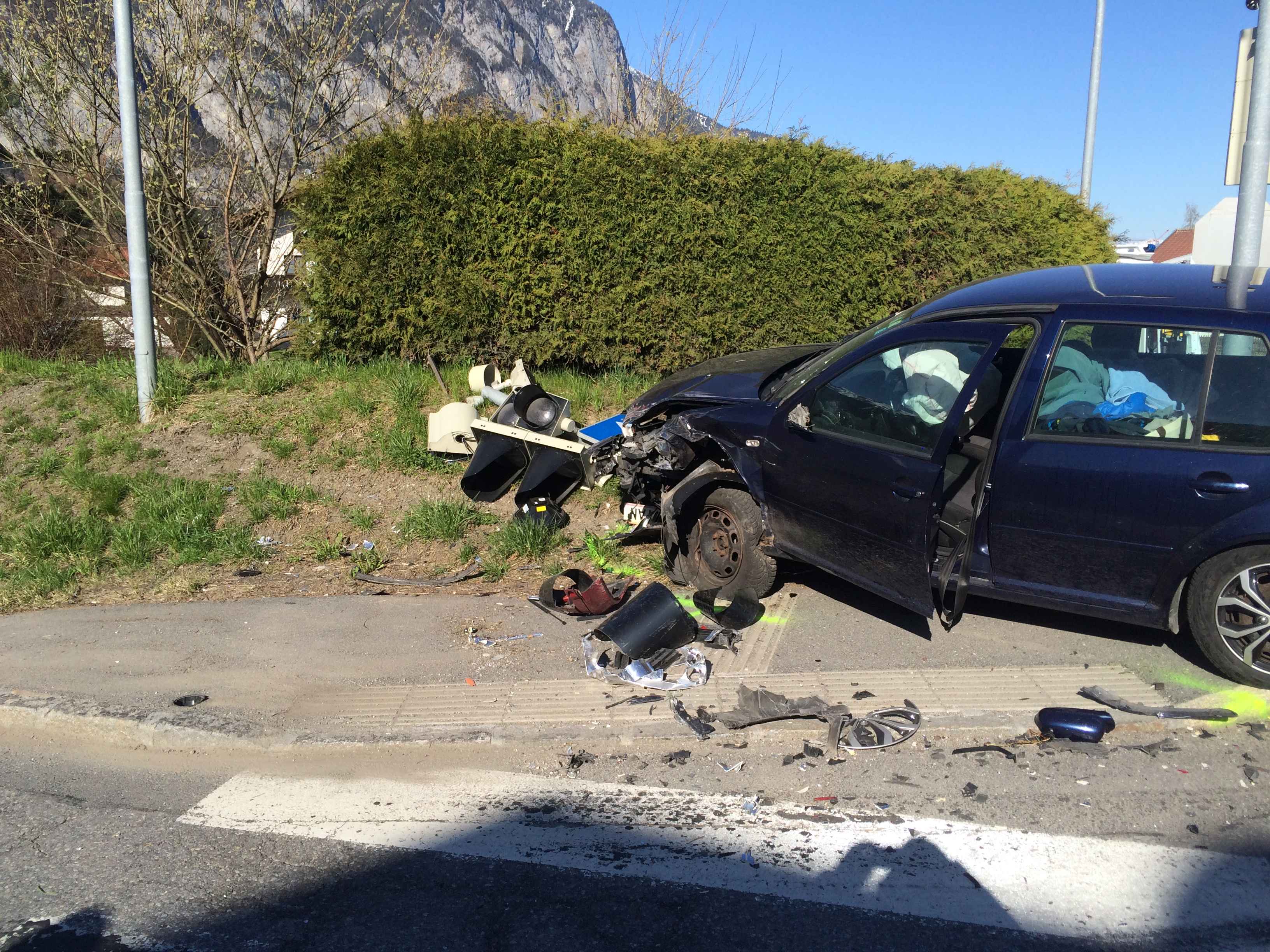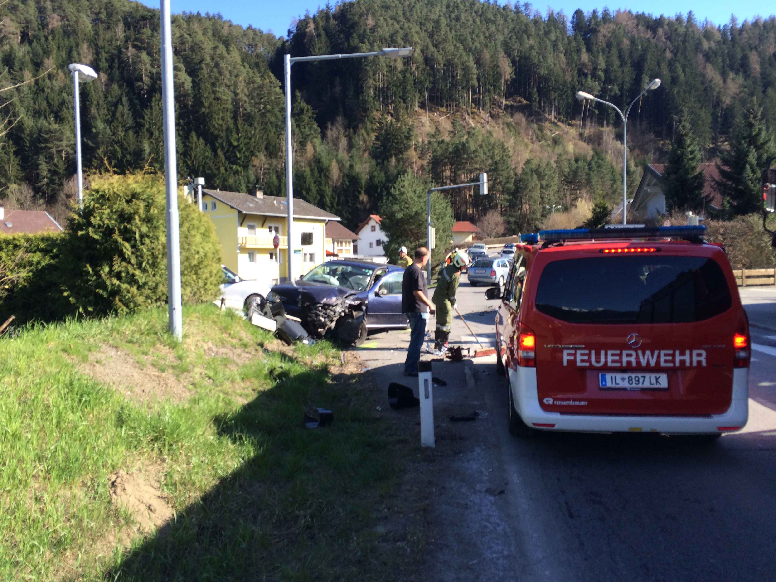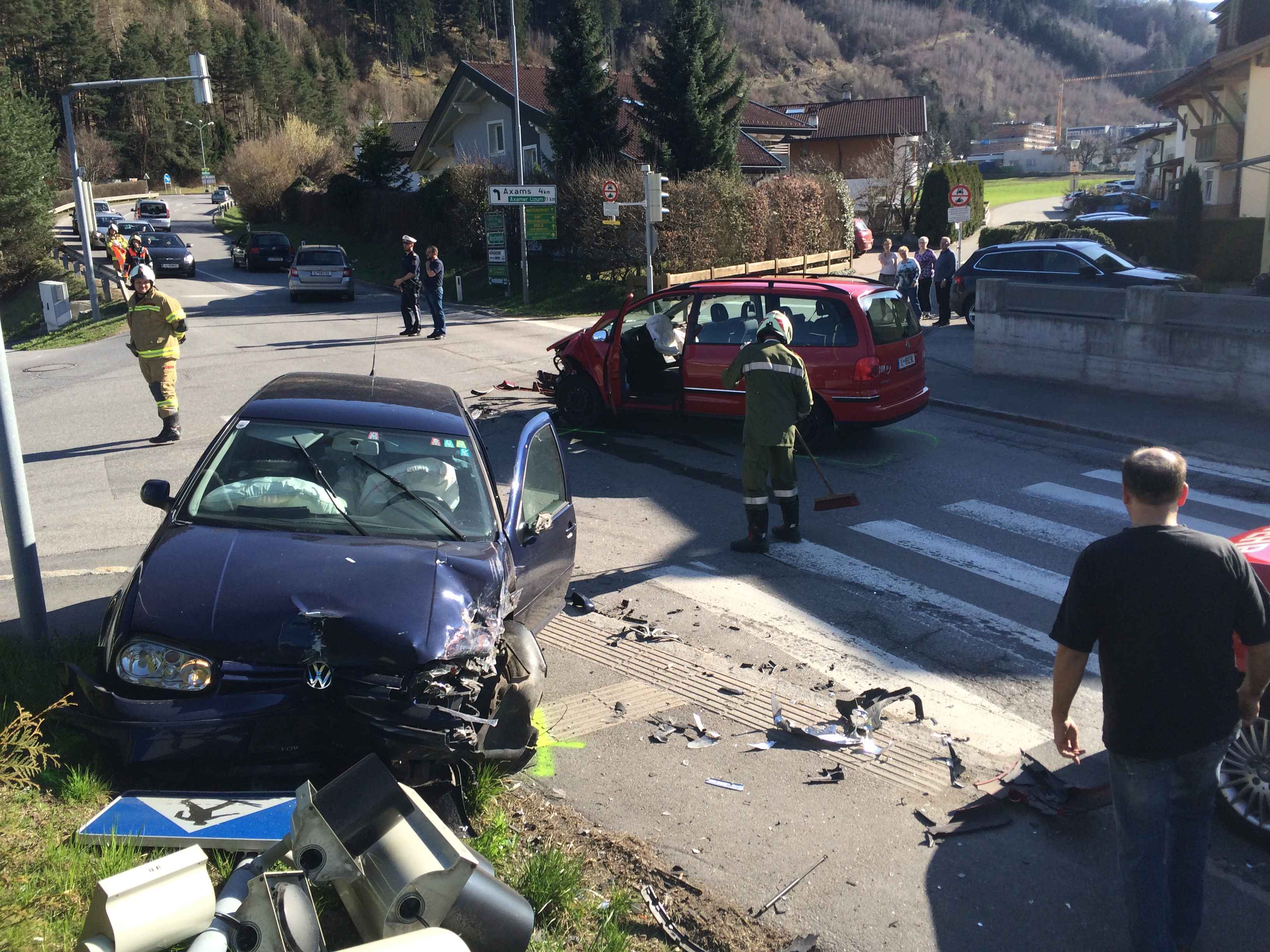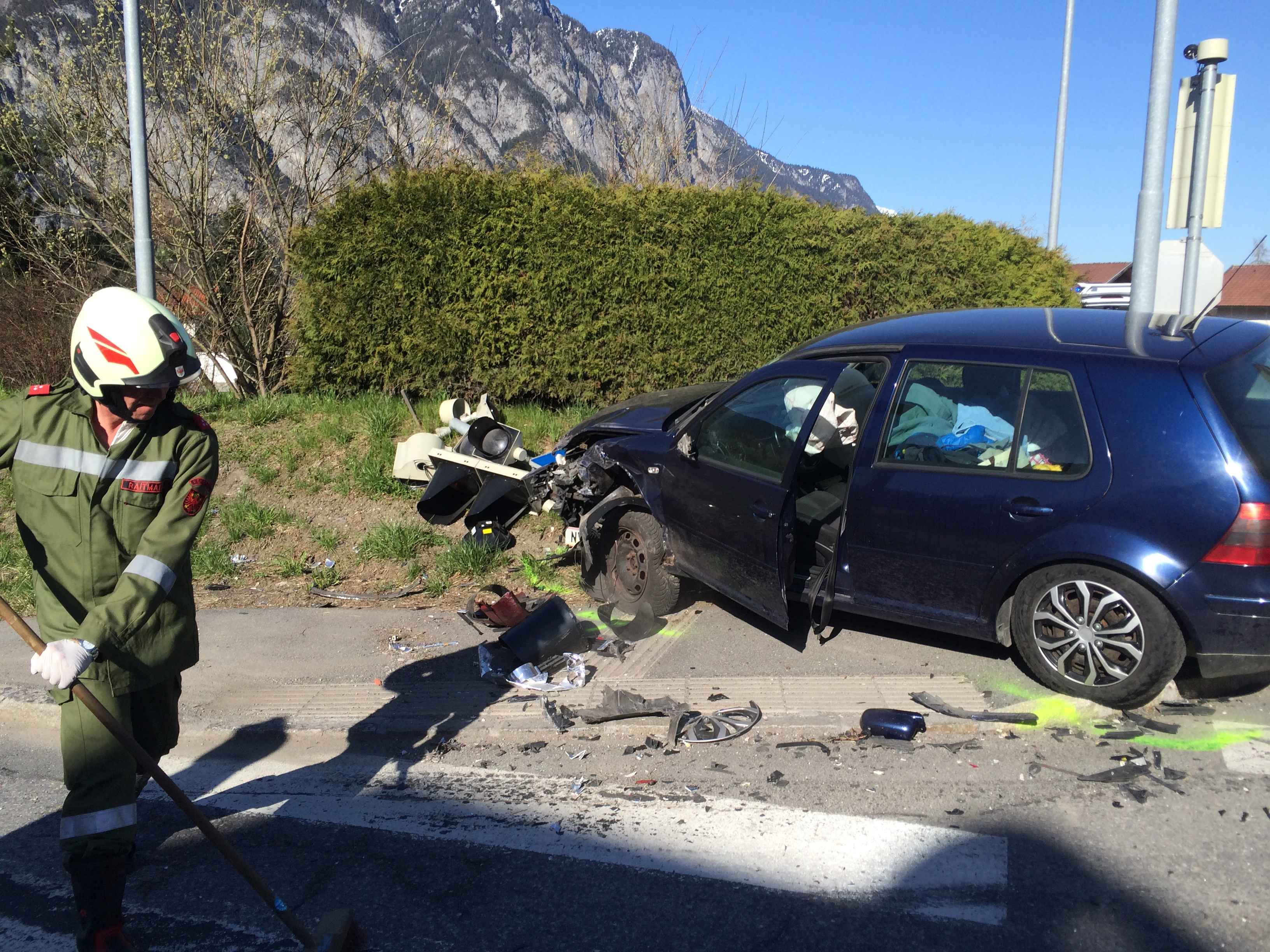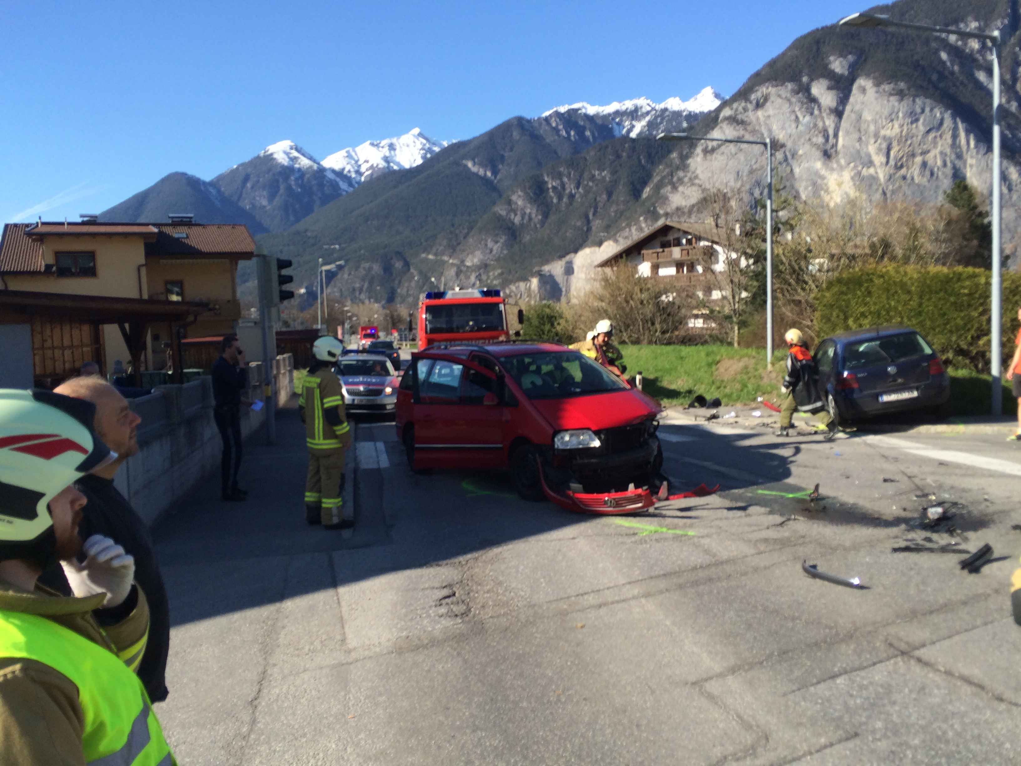 Am Samstag, 7.4.2018 gegen 16:45 Uhr ereignete sich an der Kreuzung Sellrainer Straße/Dorfstraße ein Verkehrsunfall an dem zwei PKW beteiligt waren. Ein Fahrzeug geriet dabei über den Straßenrand hinaus und touchierte die Verkehrsampel, welche durch die Wucht des Aufpralls zerstört wurde. Die am Unfall beteiligten Personen wurden durch den Rettungsdienst versorgt. Die Feuerwehr übernahm zusammen mit der Polizei die Absicherung der Unfallstelle sowie die Verkehrsregelung. Außerdem musste die Fahrbahn vom Öl gereinigt werden und Fahrzeugteile und Kleinteile entfernt werden. Die erheblich beschädigten PKW wurden vom Bergedienst abgeschleppt. Nach ca. einer Stunde konnte die Straße wieder für den Verkehr freigegeben werden. Wir waren mit ca. 20 Mann, KDOF-A, RLF-A und LAST im Einsatz.