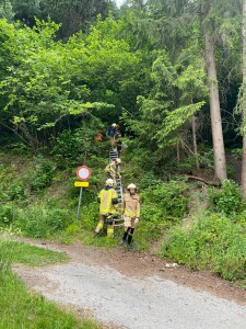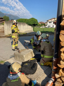 Danach wurden für das Abendessen Salate hergerichtet. Bevor das erste Fleisch auf dem Grill war, ertönte wieder die Hausdurchsage: “Unterstützung Rettungsdienst”. Die Jugendlichen rannten zu ihren Spinds und zogen sich in Rekordgeschwindigkeit um. Es galt einen Forstunfall abzuarbeiten. Die verletzte Person lag im steilen Gelände, die Feuerwehrjugend musste mittels Steckleiter und Schleifkorbtrage die Person retten. Die Jugendlichen bekamen vom Rettungsdienst Lob für ihr ruhiges, aber doch effizientes Arbeiten. Danach konnte gemeinsam gegrillt und gegessen werden.